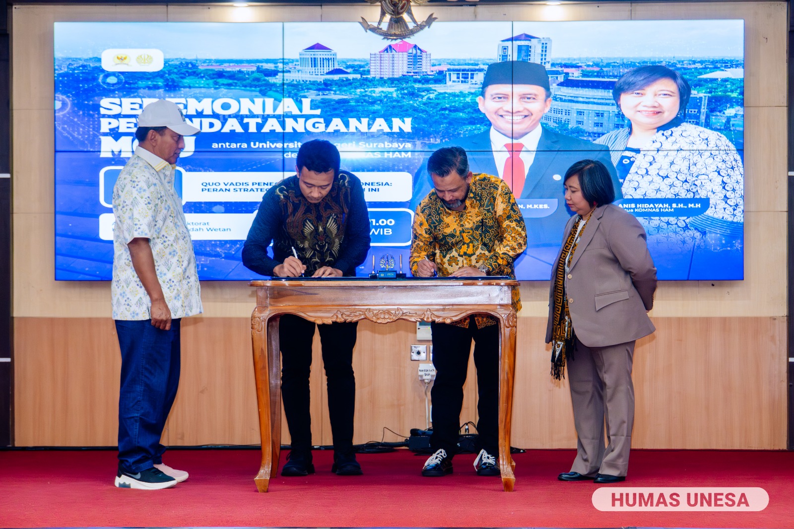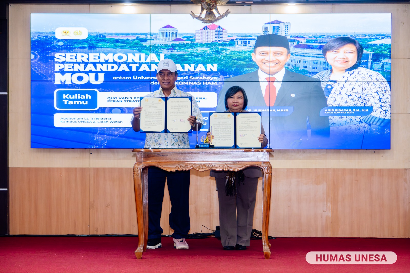 Surabaya, 5 Februari 2026 - Penguatan kerja sama kelembagaan di bidang hak asasi manusia (HAM) resmi diwujudkan melalui penandatanganan Memorandum of Understanding (MoU) dan Implementation of Agreement (IA) antara Universitas Negeri Surabaya (UNESA) dan Fakultas Hukum UNESA dengan Komisi Nasional Hak Asasi Manusia (Komnas HAM).