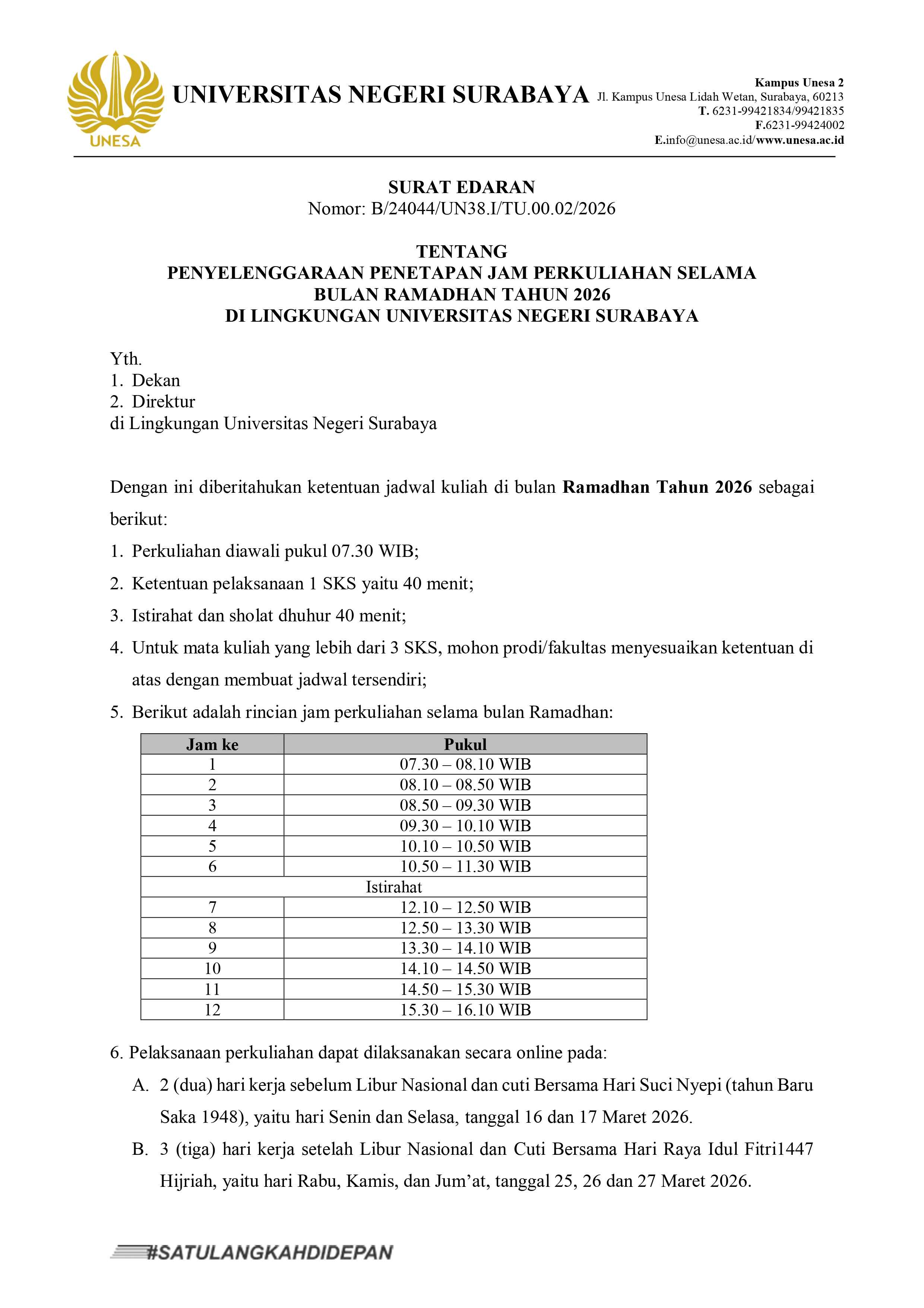 Surat Pemberitahuan Jam Ramadhan 2026 UNESA